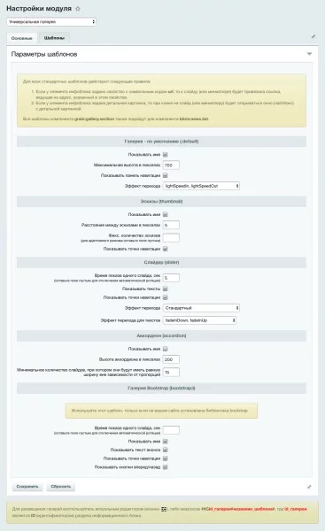 - Параметры каждого шаблона меняются в настройках модуля (Настройки > Настройки продукта > Настройки модулей > Универсальная галерея)