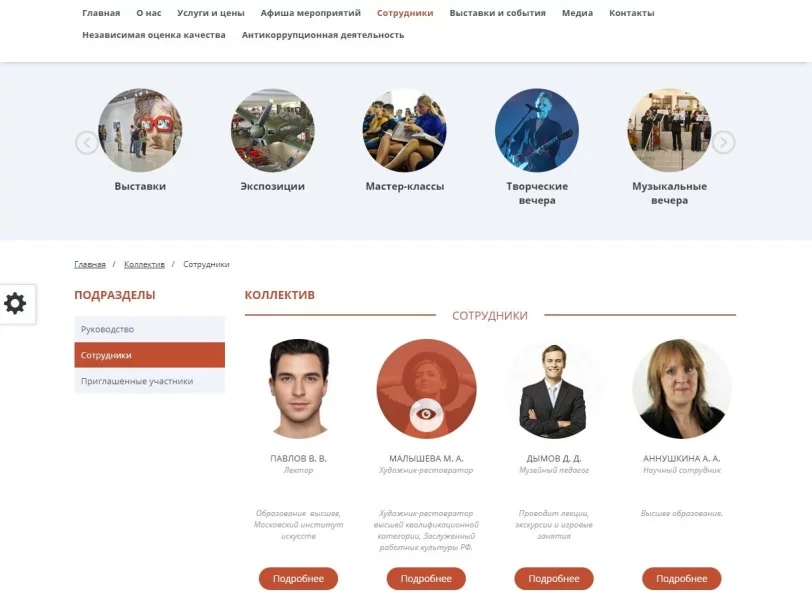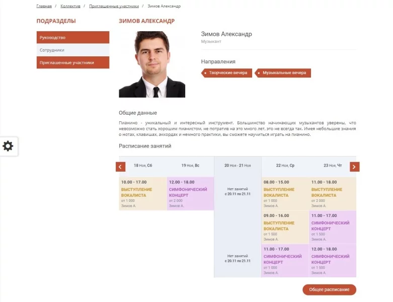 - Для каждого направления деятельности предусмотрен собственный раздел со списком сотрудников и расписанием.
