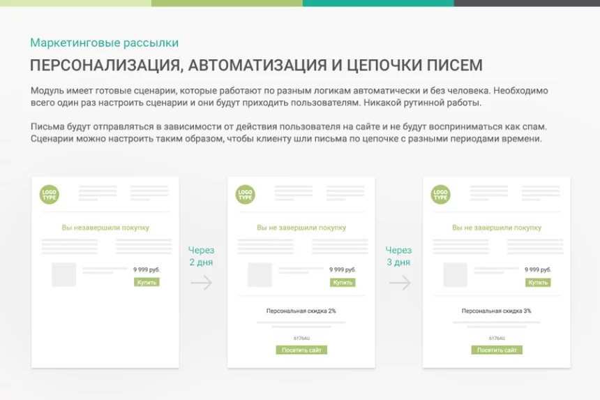 Подобный результат достигается за счет персонализации e-mail рассылок, которая обеспечивается данными из системы Битрикс и их автоматизации. Таким образом, каждое письмо, отправленное модулем, будет точечно направлять к оформлению заказа и удерживать пользователя именно в вашей компании.