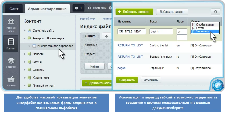 Чтобы изменить или перевести тексты вашего сайта, вам больше не придется обращаться к программистам. Модуль "Локализация" позволяет работать с шаблонами сайта, шаблонами компонентов, элементами управления, пунктами меню, включаемыми областями, SEO-свойствами страниц и статическими страницами целиком. Вы сможете самостоятельно редактировать отдельные участки текстов, сохранять их в качестве языковых фраз в файлах переводов, переводить автоматически и редактировать вручную.