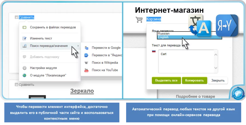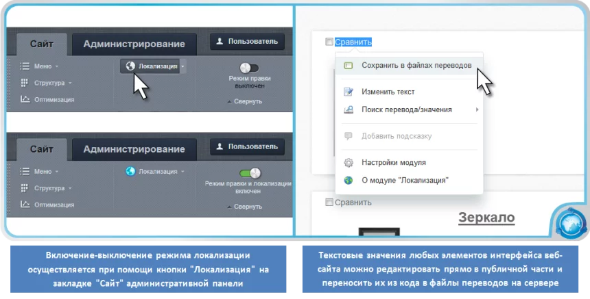 Продукт является полностью готовым к использованию и ориентирован на самую широкую аудиторию пользователей. Он не требует доработки или сложного внедрения. Для работы с модулем вам не нужно обладать навыками программирования, разбираться в структуре файлов вашего сайта и их взаимодействии друг с другом. Для начала работы нажмите на кнопку включения режима локализации на административной панели и просто выделите любой текст, который отображается на странице.