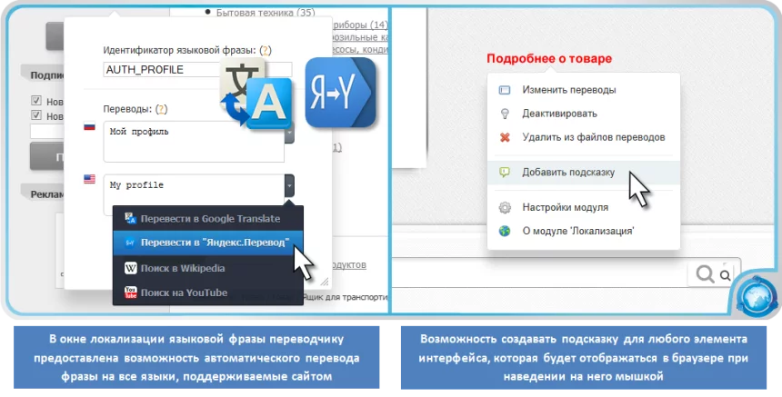 Планируете ли вы переводить тексты сайта самостоятельно, вместе с другими пользователями или будете привлекать к этой работе профессиональных лингвистов – вы сможете добиться результатов намного быстрее, воспользовавшись встроенной интеграцией инструментов редактирования модуля с популярными сервисами онлайн-перевода: Google Translate, Microsoft Translator и "Яндекс.Переводчик". В поиске смысловых значений всех незнакомых слов и выражений вам помогут интернет-энциклопедия Wikipedia и видео-хостинг YouTube.