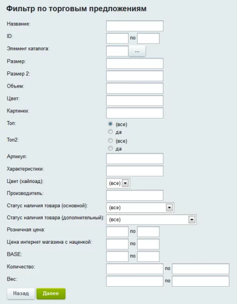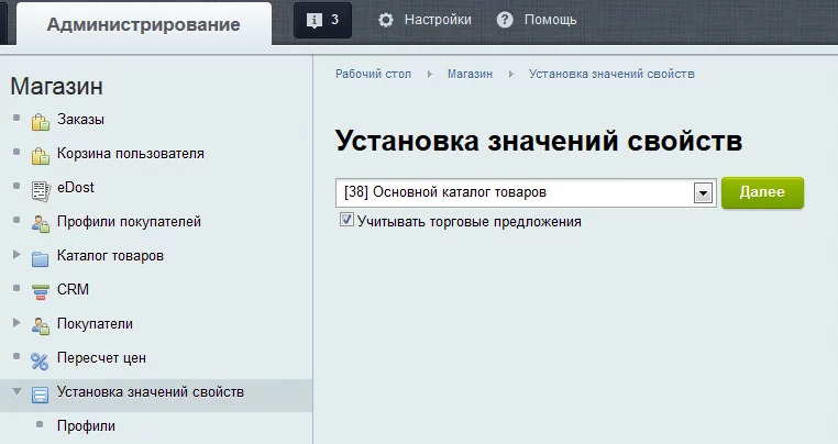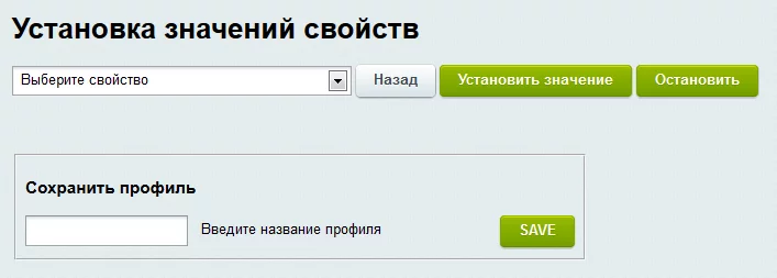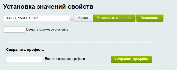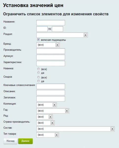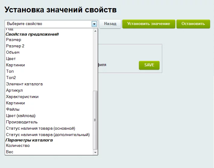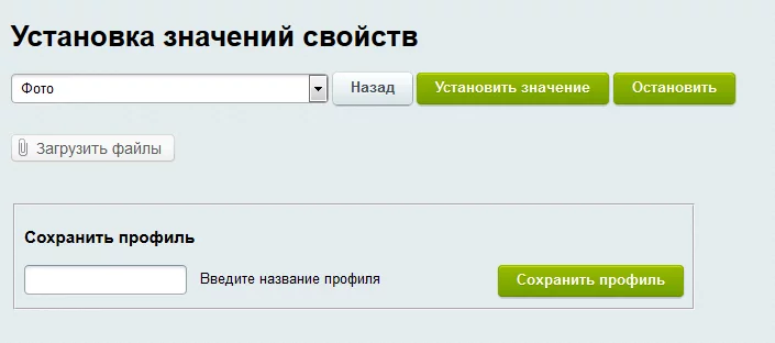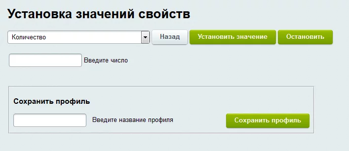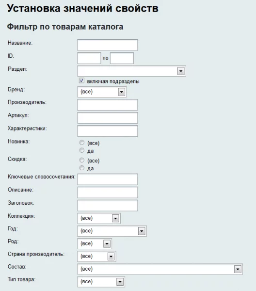 Блок установки значений свойств позволяет выставить в зависимости от выбранного набора условий или же сразу для всего инфоблока и принадлежащих ему товарных предложений значения свойств: