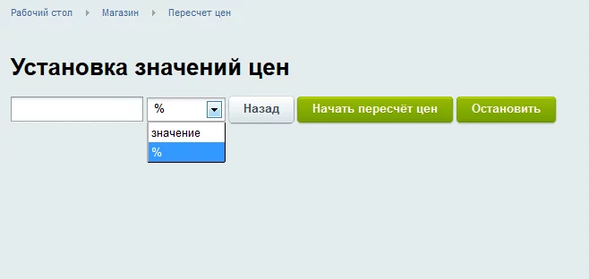 Блок пересчета цен, позволяет управлять ценами в карточках товара и товарных предложениях: