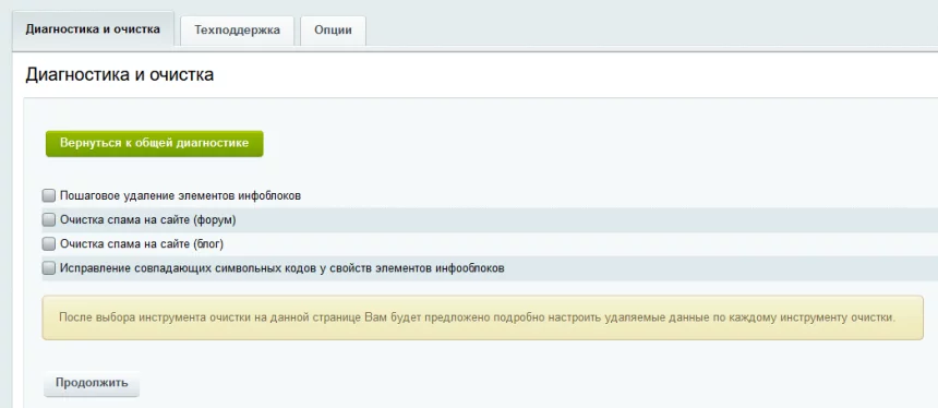 1. Удаление неактивных сайтов и связанных с ними инфоблоками – позволяет удалить не активный сайт из системы. При этом будут удалены неактивные сайты и связанные с ними инфоблоки. Если инфоблок привязан хотя-бы к одному активному сайту, то удален не будет.
