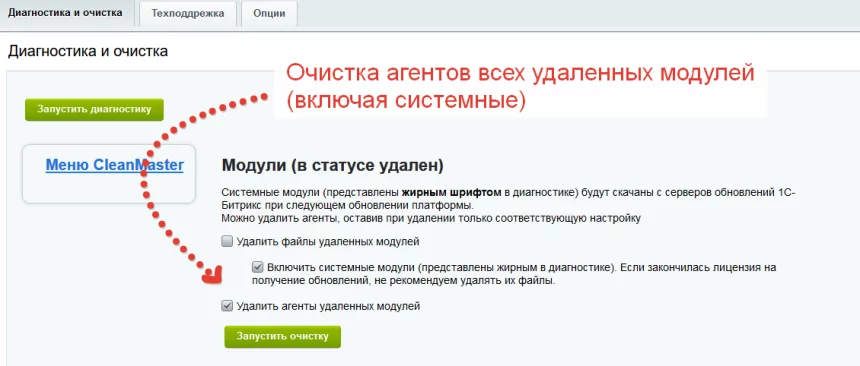 25. Удаление неиспользуемых модулей (в статусе удален). Можно удалить как системные, так и сторонние модули. Также можно очистить зарегистрированные события и агенты удаленных модулей, а также почистить специальный кэш обновления модулей.