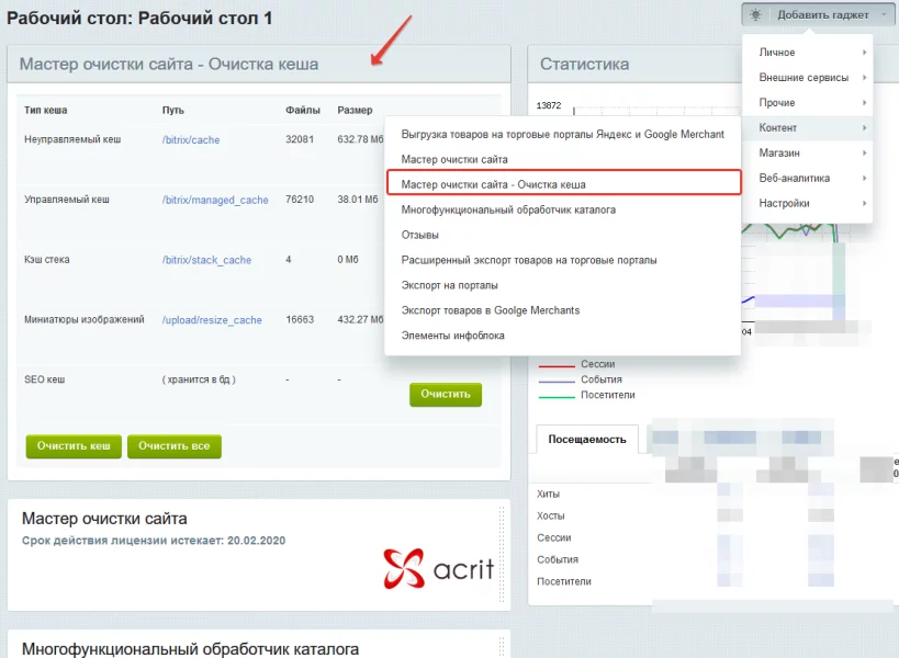 19. Виджет на рабочий стол с очисткой кэша и SEO-кэша модуля инфоблоков