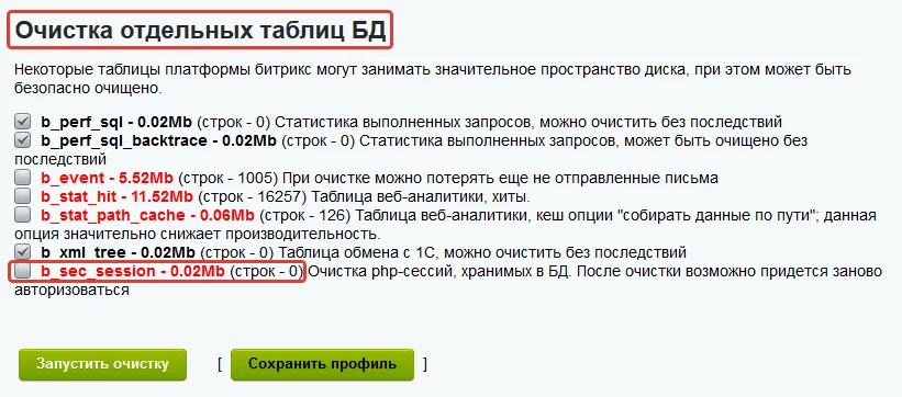 32. Очистка отдельных таблиц БД. В текущей версии поддерживается очистка безопасных для работы сайта таблиц: b_perf_sql, b_perf_sql_backtrace, b_event, b_stat_hit, b_stat_path_cache, b_xml_tree, b_sec_session, b_sale_viewed_product