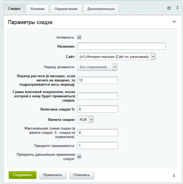 При создании скидки, модуль автоматически создает для неё группу пользователей и привязывает скидку к этой группе. При достижении определенной суммы стоимости покупок, покупатель автоматически попадает в эту группу и пользуется указанной скидкой.