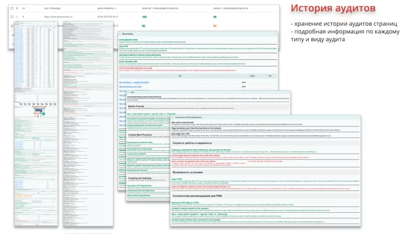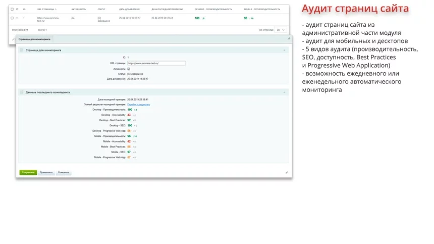 ![]() | Интеграция с Google PageSpeed Insights | ![]() | Аудит страниц сайта (с сохранением истории) непосредственно из административной части сайта | |