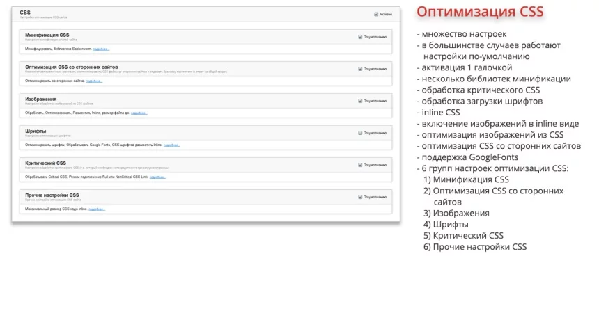 Модуль построен по принципу "All-In-One" и предоставляет полный комплекс инструментов для ускорения загрузки и отображения вашего сайта в браузере посетителей.