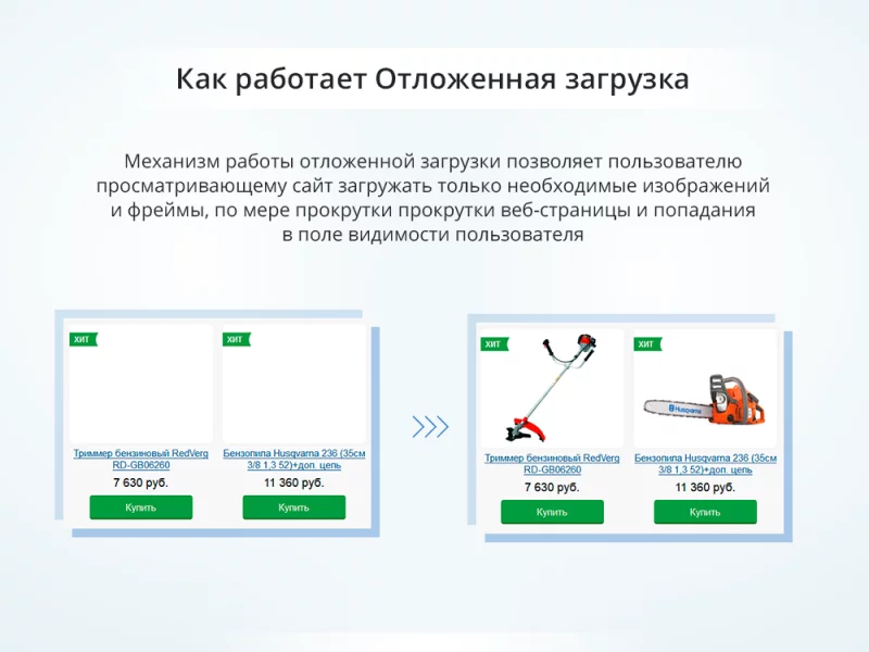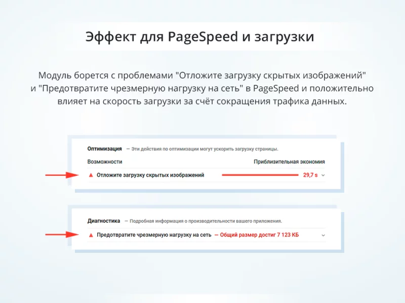 Модуль положительно влияет на оценку Google Page Speed и решает проблему "Отложите загрузку скрытых изображений", на которой монитор Google поддерживает постоянный акцент.