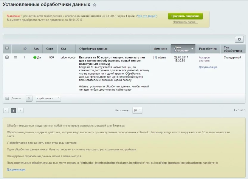 Пользовательские обработчики данных могут лежать в /bitrix/php_interface/include/askaron.handlers1c/ или в /local/php_interface/include/askaron.handlers1c/