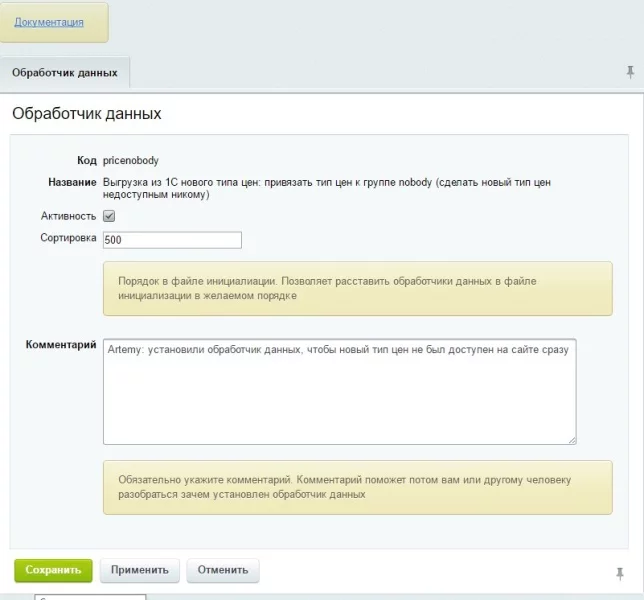 Обработчики данных содержат действия, которые надо выполнить при наступлении определенных событий. Например, когда что-то выгружается из 1С и записывается на сайте.