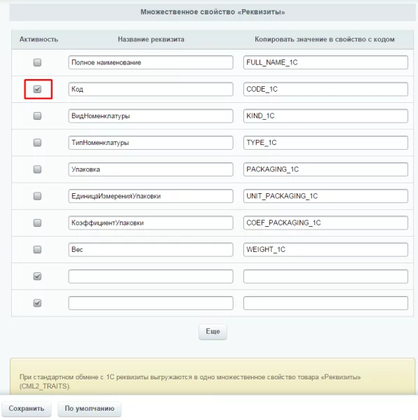 Стандартный обмен с 1С выгружает дополнительные данные о товаре в одно множественное свойство инфоблока «Реквизиты»: