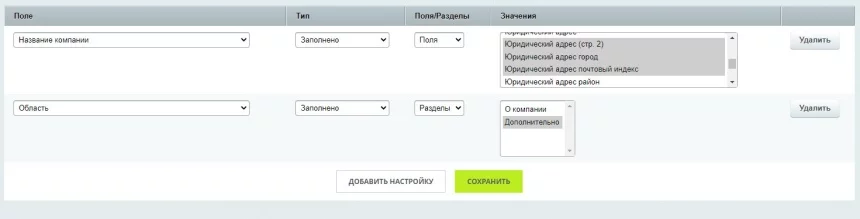 - Зависимые поля привязываются к значениям родительского поля (для списочных полей, полей с типом привязка, да/нет).