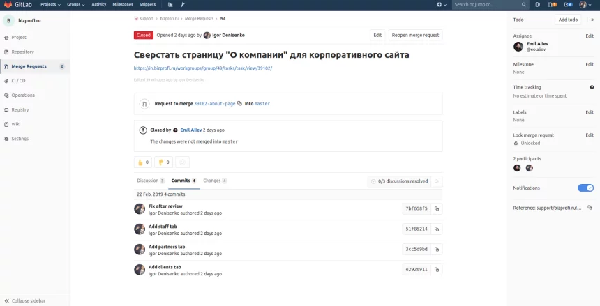 Каждый раз, когда на Gitlab’е происходит что-то значимое - к соответствующей задаче добавляется соответствующий комментарий: