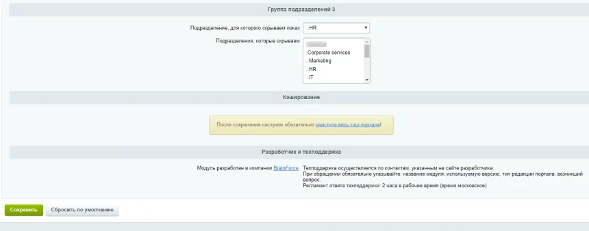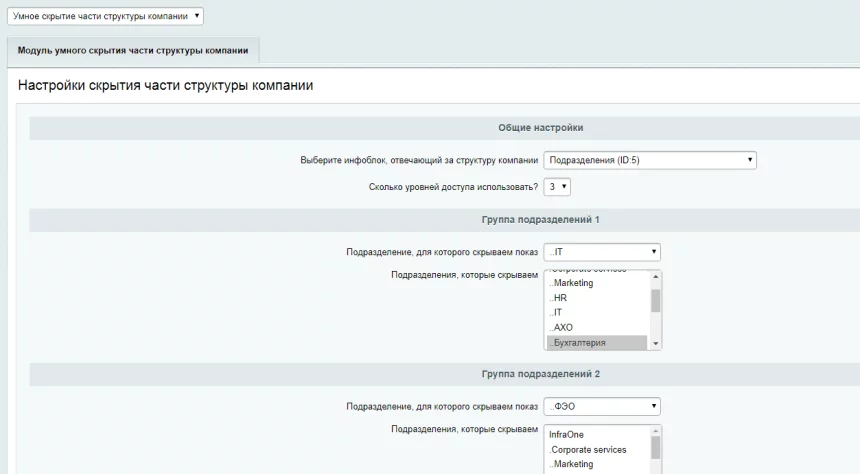 Очень прост в настройке: указывайте, для какого департамента какие отделы нужно скрыть. Поддерживается множественность скрываемых отделов.
