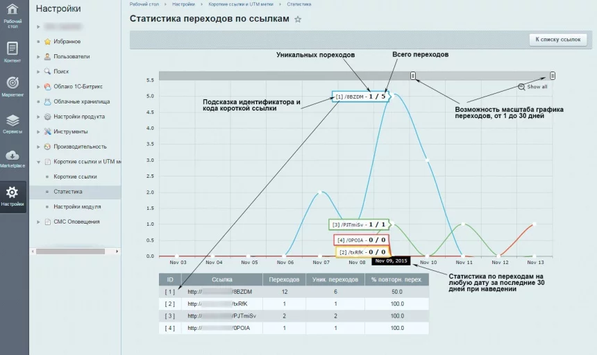В модуле есть Статистика переходов по коротким ссылкам, при этому считаются все переходы и отдельно уникальные. Просмотр статистики возможен как по одной ссылке, так и по нескольким одновременно.
