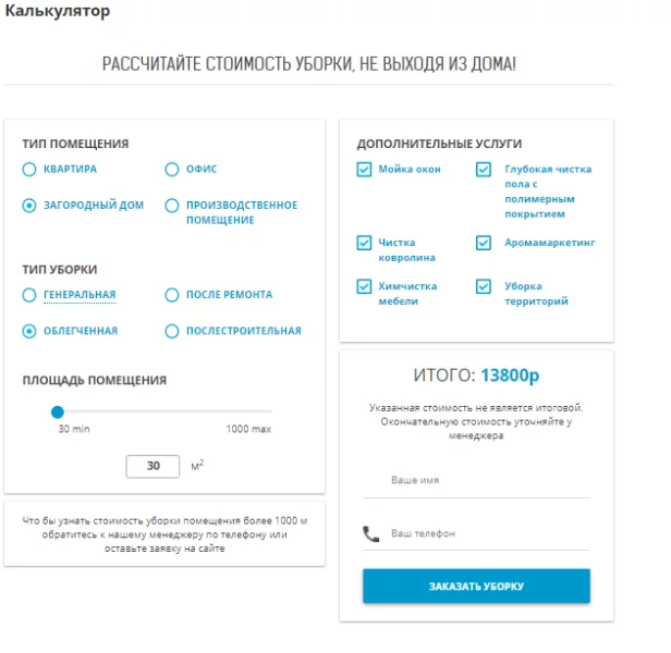Калькулятор позволяет посетителям сайта рассчитать стоимость уборки в зависимости от типа помещения, типа уборки, площади помещения и дополнительных услуг.