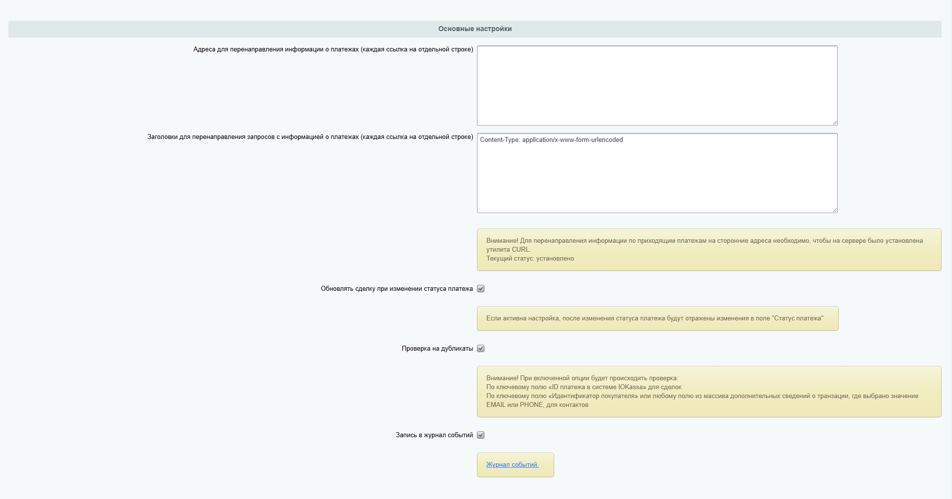 2. для работы отправки уведомлений на другие URL-адреса необходим установленный на сервере плагин CURL.