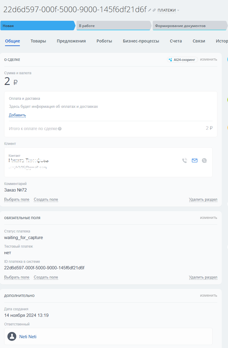 На основе полученных данных создается 2 сущности: сделка (информация о платеже) и контакт (информация о плательщике).