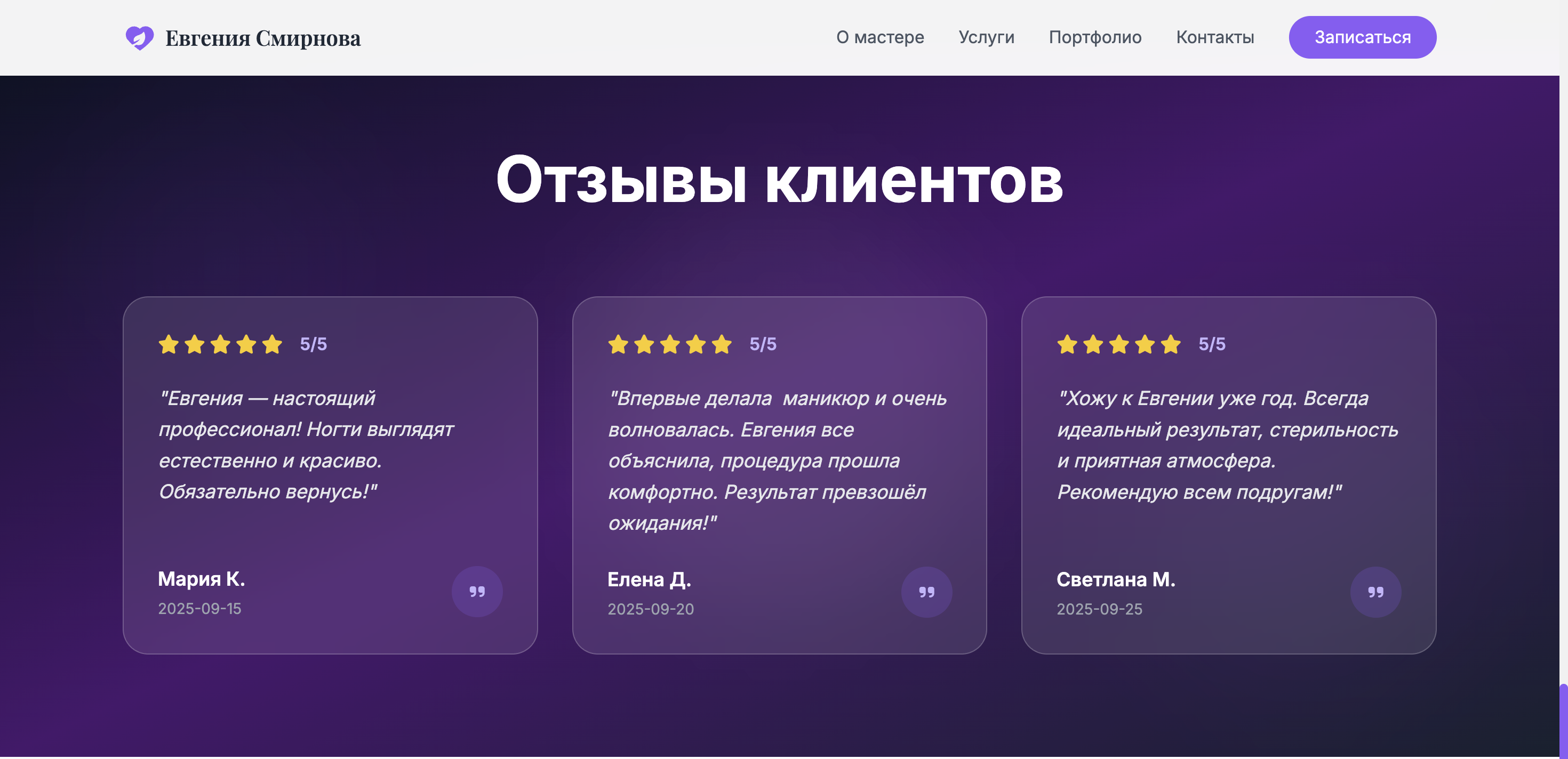 Современный одностраничный веб-сайт для мастера маникюра и педикюра, разработанный на платформе 1C-Bitrix. Решение представляет собой полнофункциональный landing page с премиальным дизайном, системой управления контентом и интеграцией форм обратной связи.