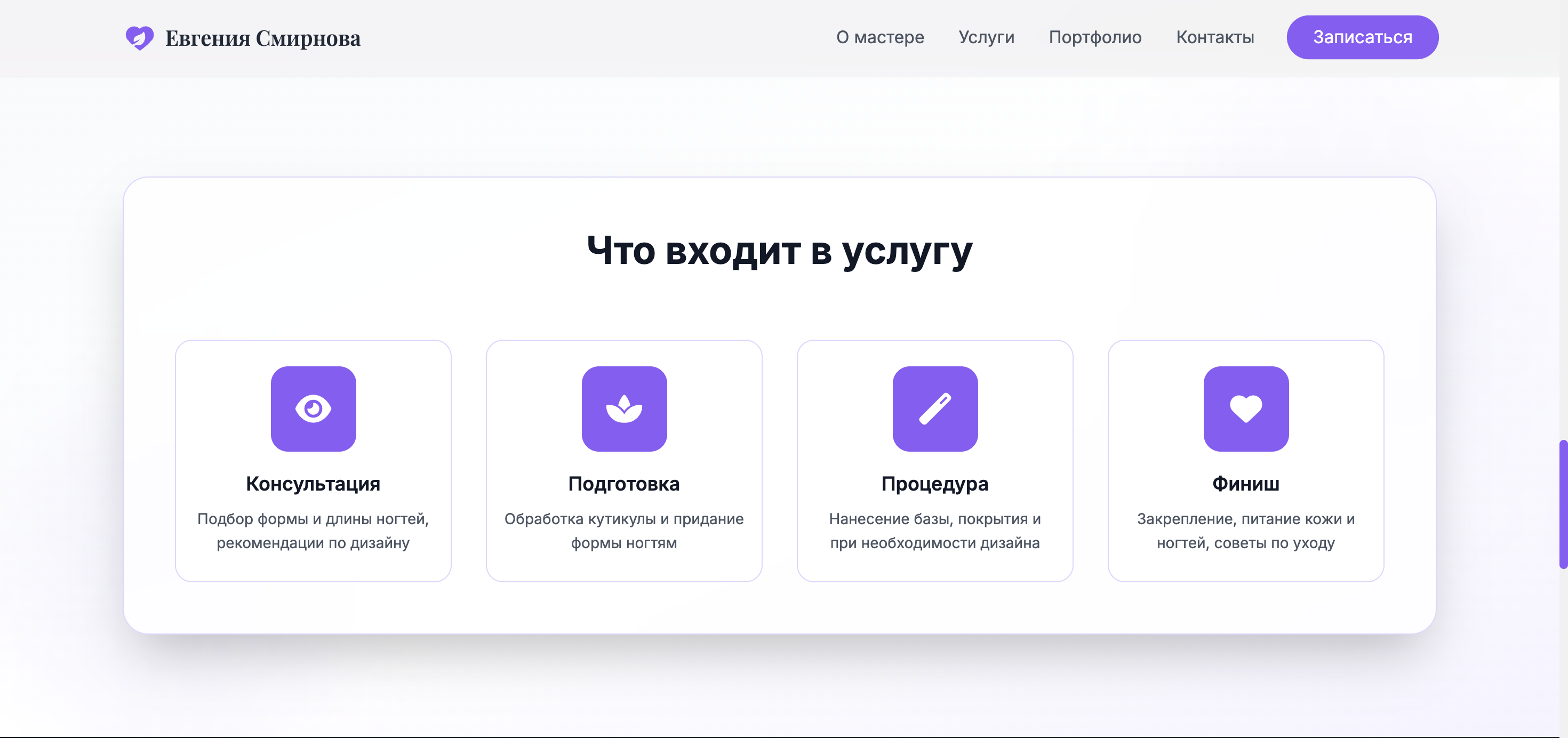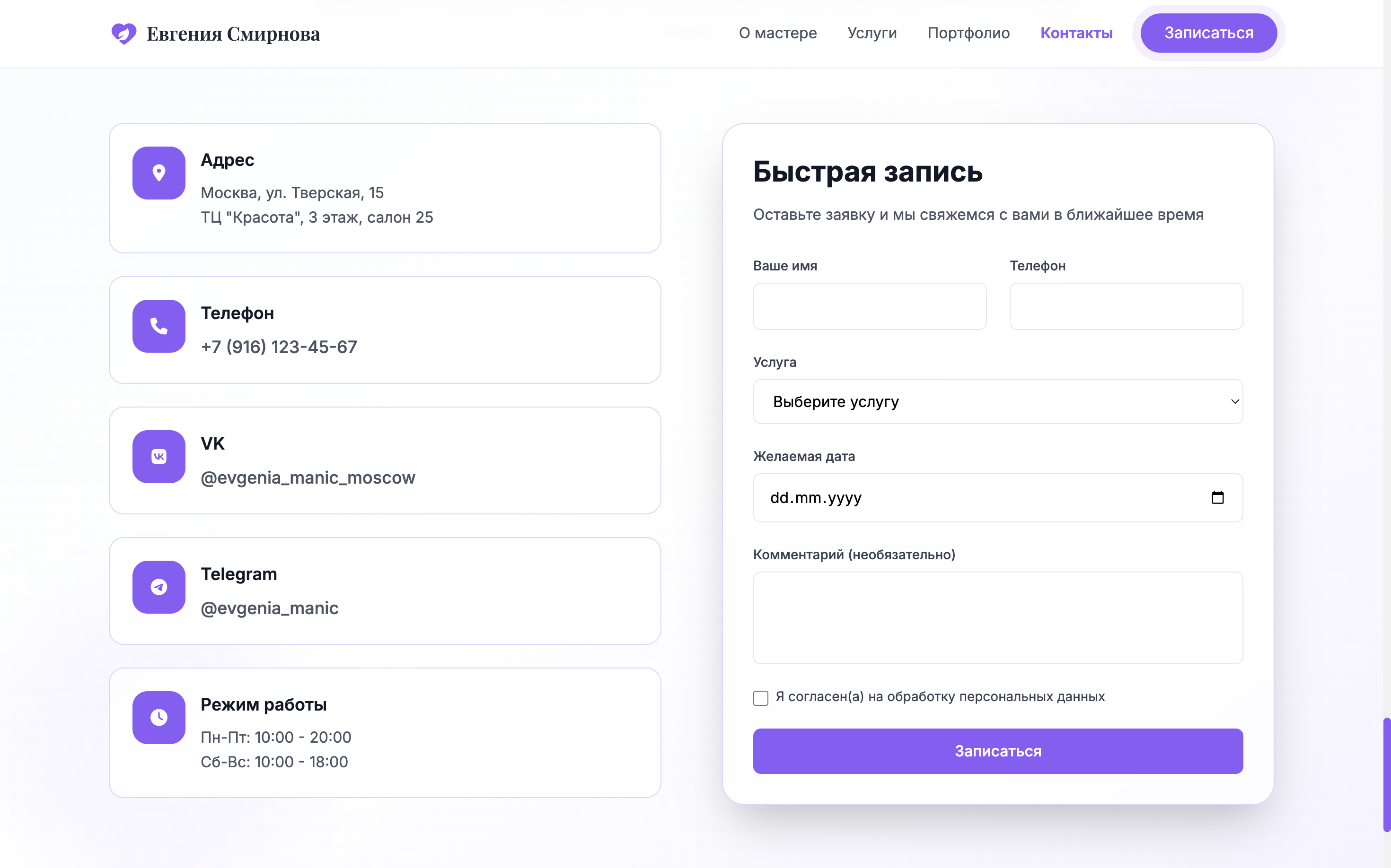 - Услуги — карточки с фото, описанием, ценой и длительностью