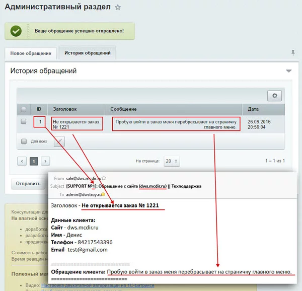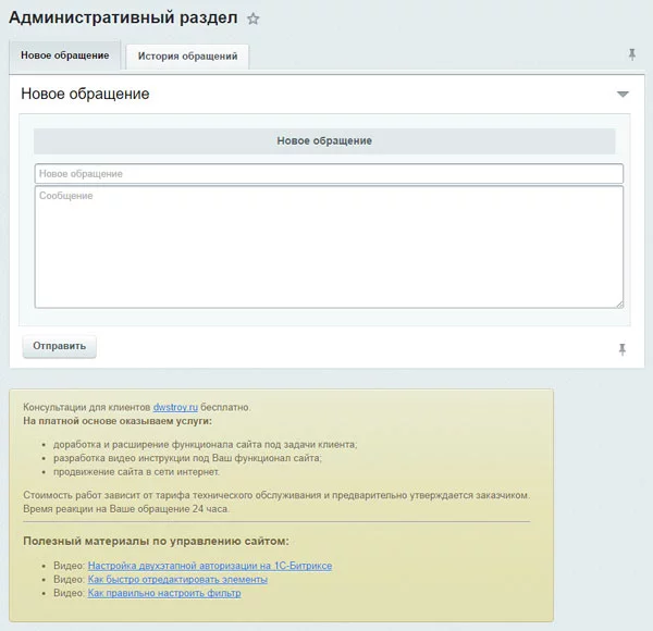 Для улучшения клиентского сервиса мы разработали данный модуль, который можно установить на любую редакцию 1С-Битрикс. С помощью модуля «Обращение в техподдержку» владелец сайта с легкостью сформирует заявку или задаст интересующий его вопрос из административной части сайта. Модуль автоматически отправит данное уведомление на Email обслуживающей веб-студии.