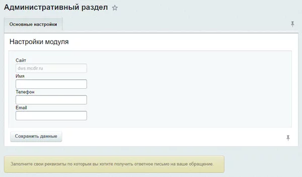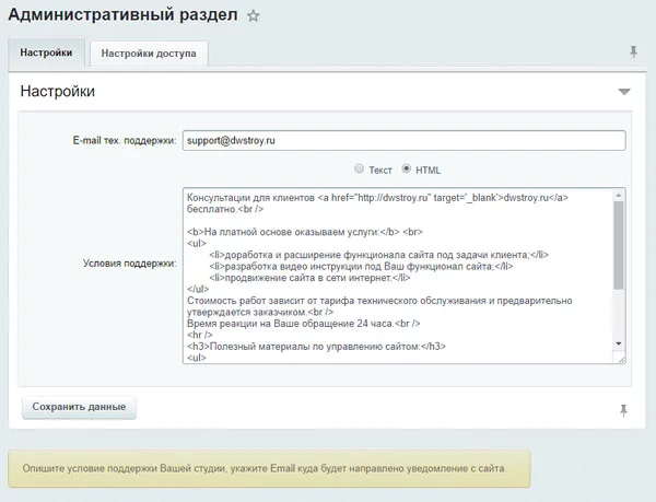 Простота установки и настройки модуля не требуют определенных знаний. Разработчик прописывает условия Техподдержки (тарифный план) и свой Email, куда ему удобно получать данные уведомления, а клиент без лишних усилий у себя на сайте направляет заявки через форму сообщения.