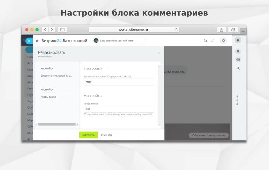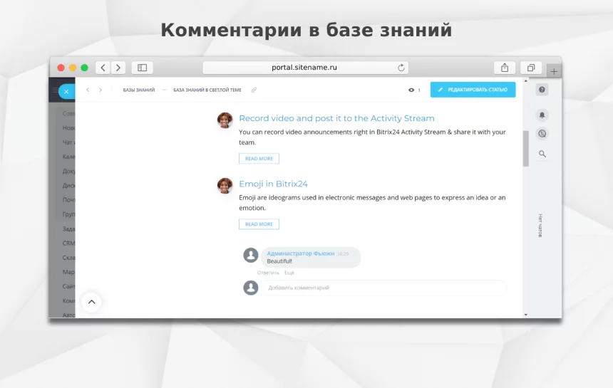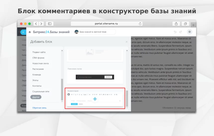 Приложение добавляет в стандартный конструктор базы знаний блок «Комментарии». Он представляет собой стандартные комментарии «Битрикс24».