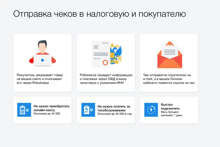 Модуль поддерживает Робочеки - для отправки чеков в налоговую не требуется покупать или арендовать онлайн-кассу. Оплата покупок и передача фискальных чеков будет осуществляется через онлайн-кассу Robokassa. Возможно подключение к Робокассе как юридическими, так и физическими лицами.