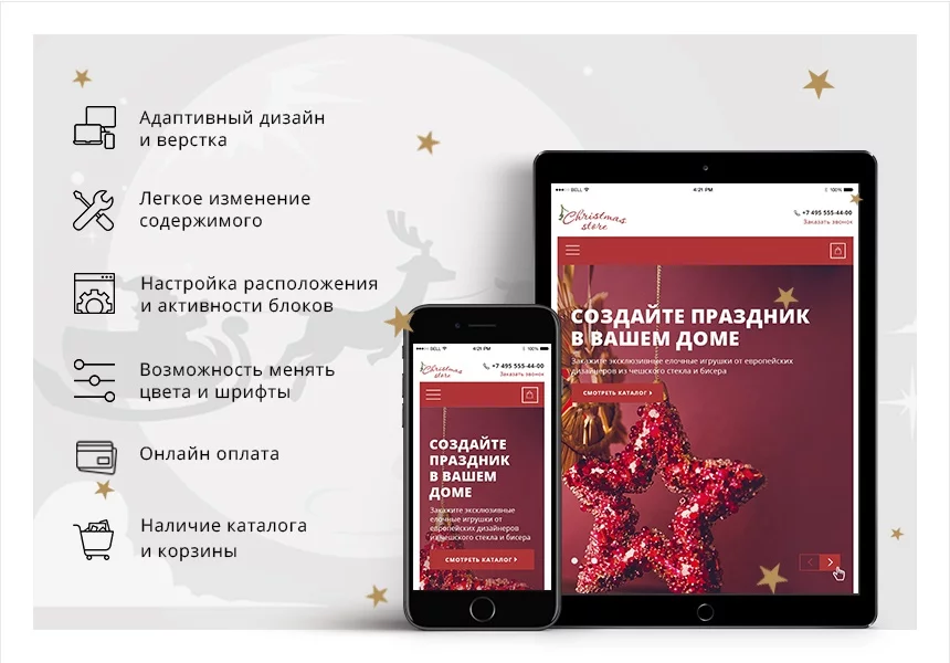 Дизайн решения оптимизирован для компаний, которые занимаются продажей подарков и сувениров, но в то же время может быть адаптирован и под другие области благодаря нашей системе настройки шаблона: