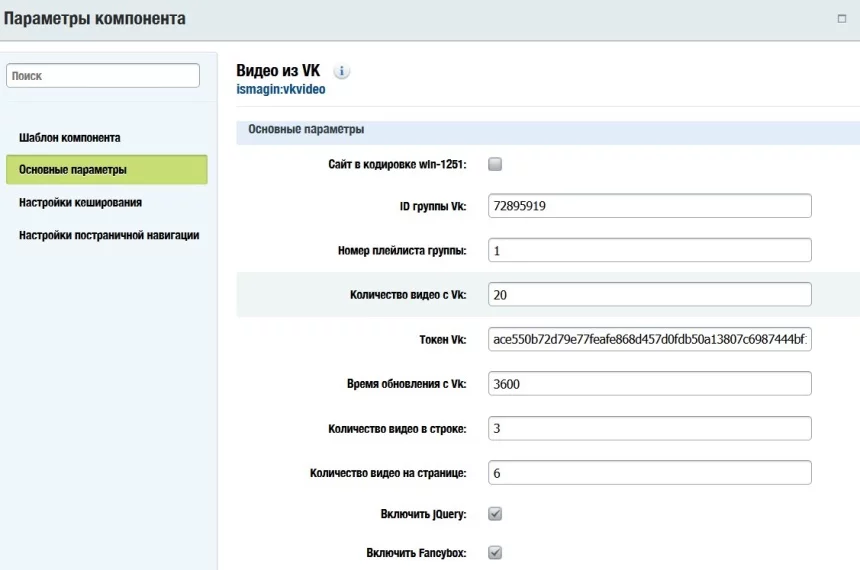 Не использует инфоблоки. Название, заставка и сам видеоролик автоматически подгружаются с Vk. Видео проигрывается во всплывающем окне в стандартном плеере Vk.