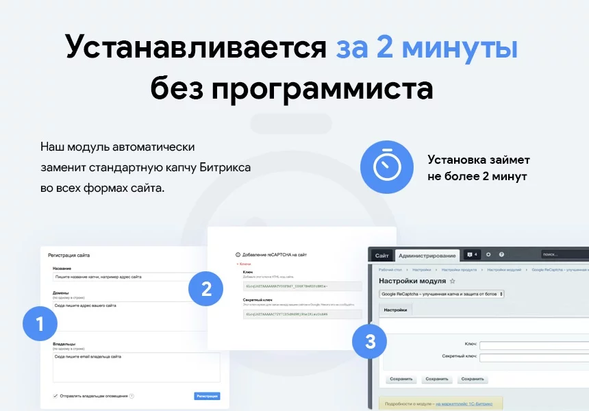 Модуль itd.recaptcha автоматически заменяет стандартную CAPTCHA Битрикса на современную защиту от спама и ботов. Настройка занимает 5 минут — без программиста и доработки кода.