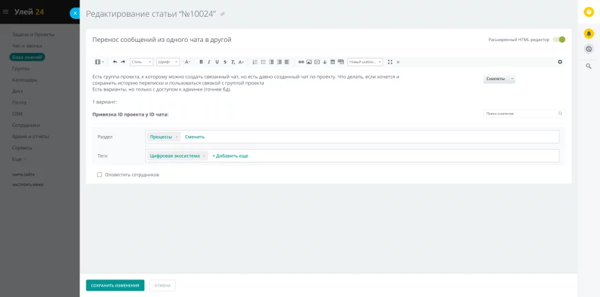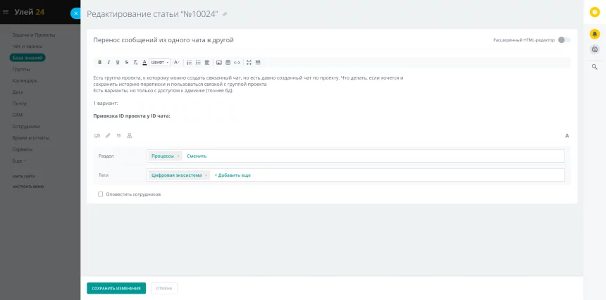 Для оповещения сотрудников каждый раздел базы знаний имеет привязку к подразделению, сотрудников которых необходимо уведомлять при добавлении и обновлении материалов. Это опциональная возможность, на выбор человека, публикующего или редактирующего материал.
