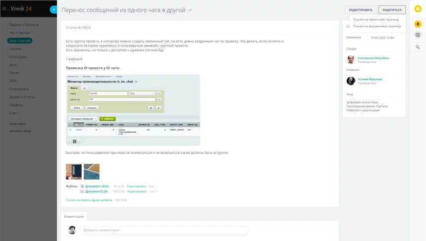 Сотрудники могут делиться статьями с внешними пользователями. Функционал полезен в случаях, когда есть потребность поделиться конкретным регламентом или инструкцией с подрядчиком или внешними сторонами, участвующими в проекте.