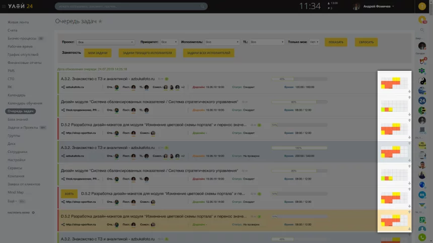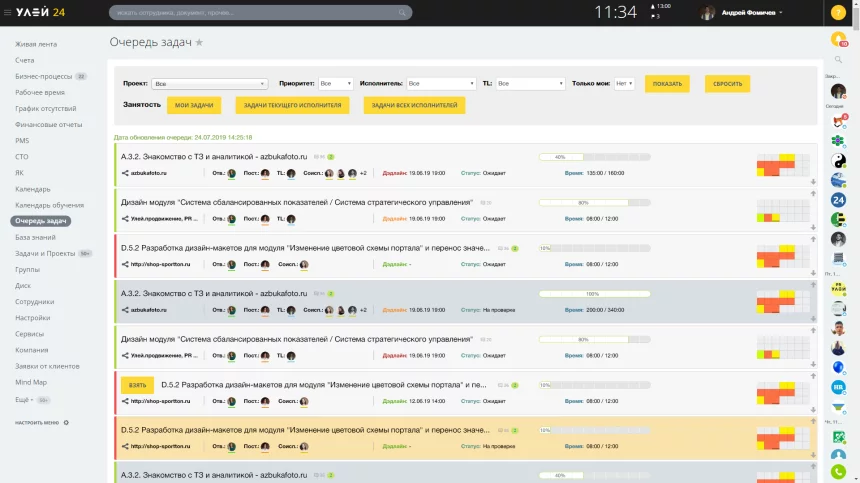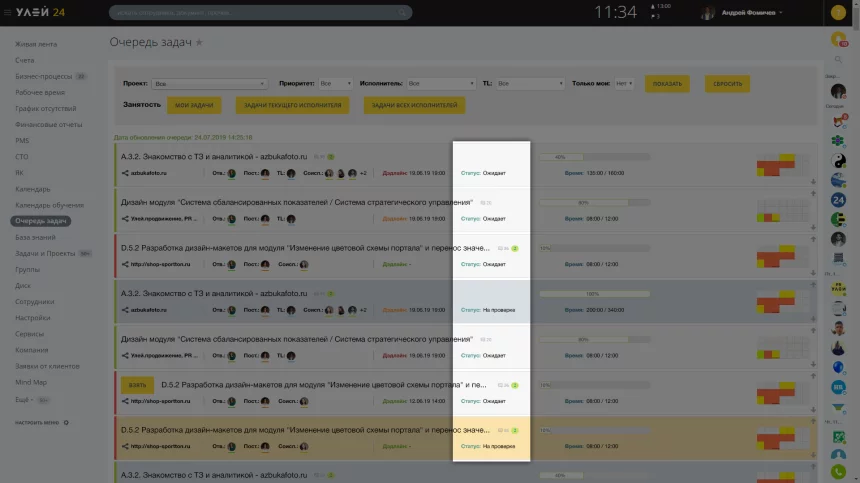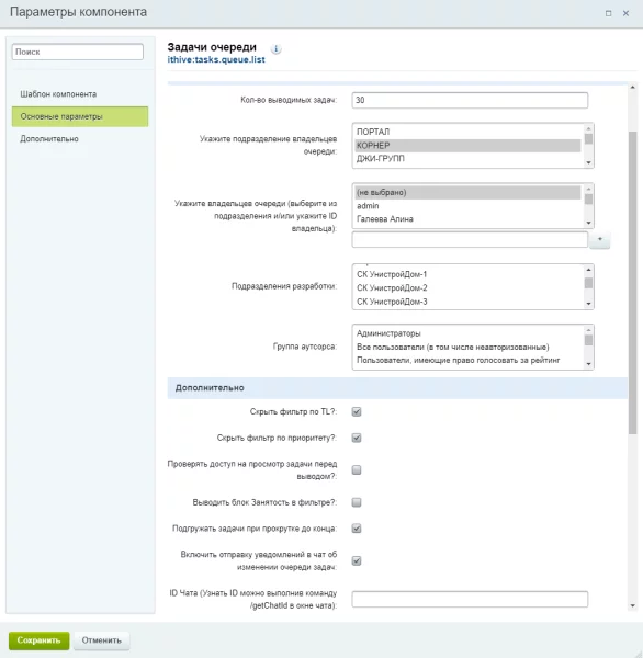 | Модуль автоматически отслеживает изменение приоритетов любым из модераторов и обновляет очереди у сотрудников во всех открытых страницах браузеров, для чего используется модуль Push'n'Pull. Так же модуль умеет отправлять уведомления в указанный чат при событии изменении очереди задач сотрудника. |