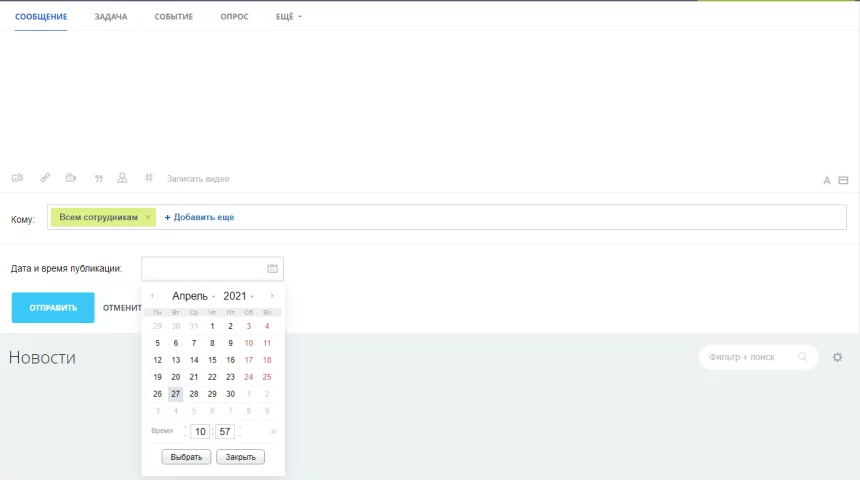 Модуль добавляет поле с возможностью настроить дату и время публикации сообщения в Живой ленте (Новости).