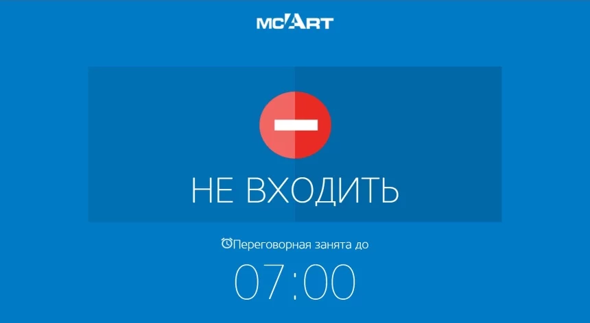 Его работа заключается в том, чтобы отображать занятость/не занятость переговорных. Если в расписании есть запись о резервировании переговорной комнаты, то в указанное время на весь экран устройства, синхронизированного с корпоративным порталом, будет транслироваться логотип вашей компании, а так же данные о времени занятости.