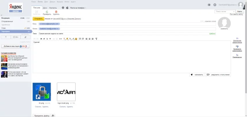 1. Создаете письмо на своем корпоративном почтовом ящике. Укажите: