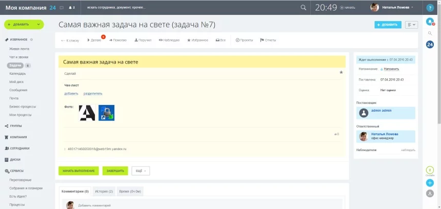 - Если на письмо будет получен ответ, он привяжется к задаче в виде комментария.