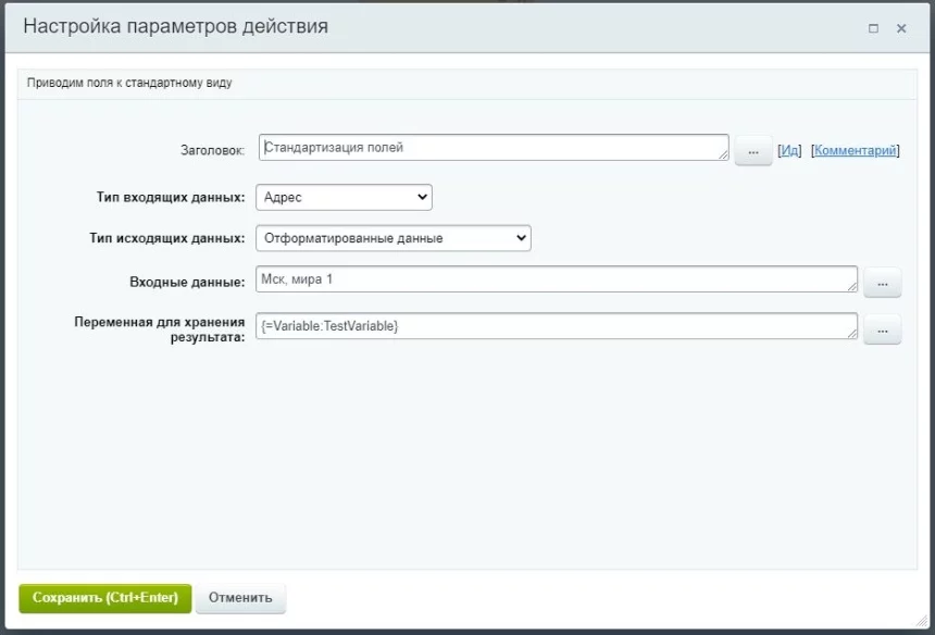 Модуль предназначен для стандартизации данных Вашей компании. Неполные, или заполненные с ошибкой, данные переводит в полный стандартизированный формат. Активити работает на основе сервиса Dadata и в данный момент работает со следующими данными (на входе и выходе):