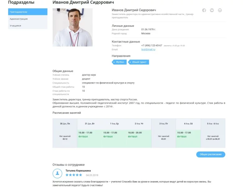 - Личная страница каждого преподавателя с его заслугами и наградами, а так же блоком занятий, которые он ведет.