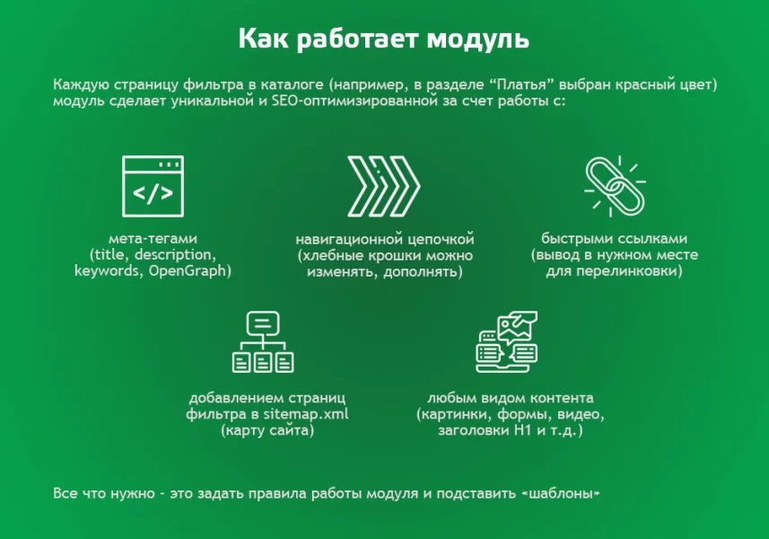 Модуль автоматически применяет уникальные заданные SEO настройки для множества страниц умного фильтра, созданных по условиям. Можно использовать разные шаблоны (названия и значения свойств товаров и торговых предложений, названия раздела, свойства раздела, описание и многое другое).