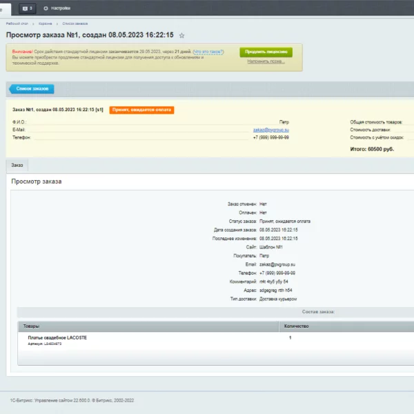 - Для удобства работы с заказами создан интерфейс с фильтром в административном разделе в меню Корзина -> Список заказов.