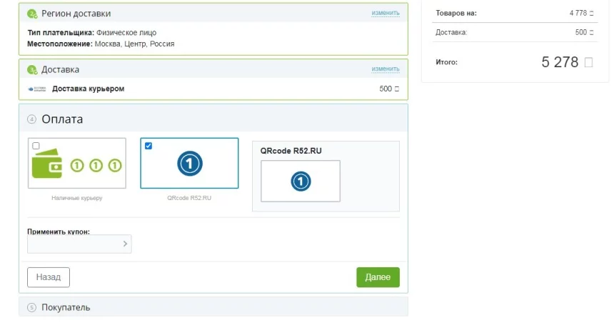 Модуль подходит для интернет-магазинов. После его установки на сайте, помимо прочих способов, появляется возможность оплатить товар с помощью QR-кода. Когда пользователь выбирает этот способ оплаты, генерируется QR-код платежного документа. Он выводится на странице подтверждения заказа и в списке заказов, а также может “пристегиваться” к email о покупке товара.