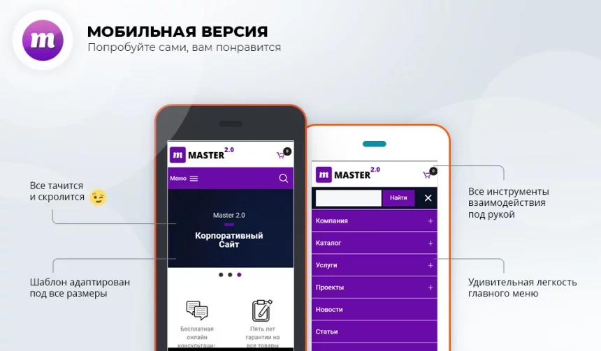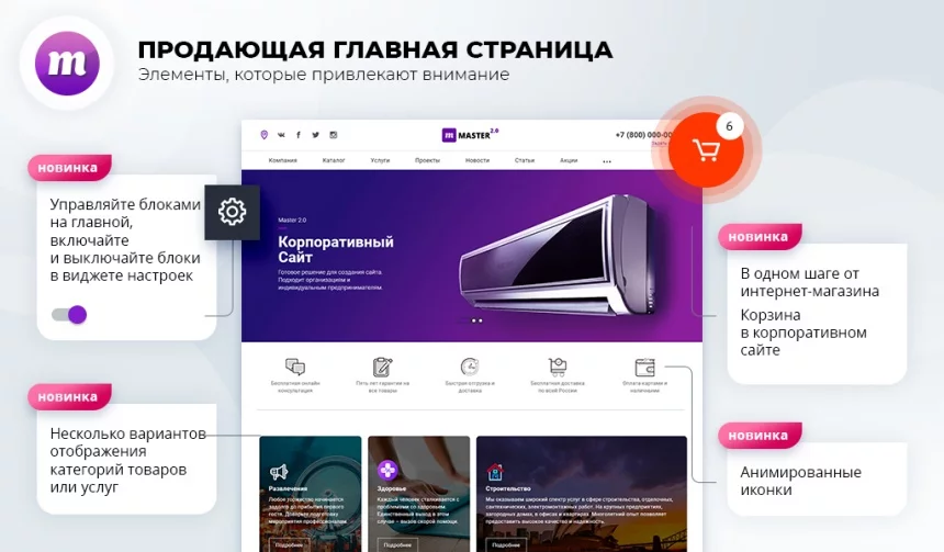 Master — универсальный сайт компании для товаров и услуг любой тематики, который содержит конструктор лендингов “из коробки” и неограниченные возможности для настройки и персонализации. Разработан с учетом потребностей малого и среднего бизнеса. Создайте сайт вашей компании уже сегодня, используя готовое решение Master и неограниченные возможности настройки.