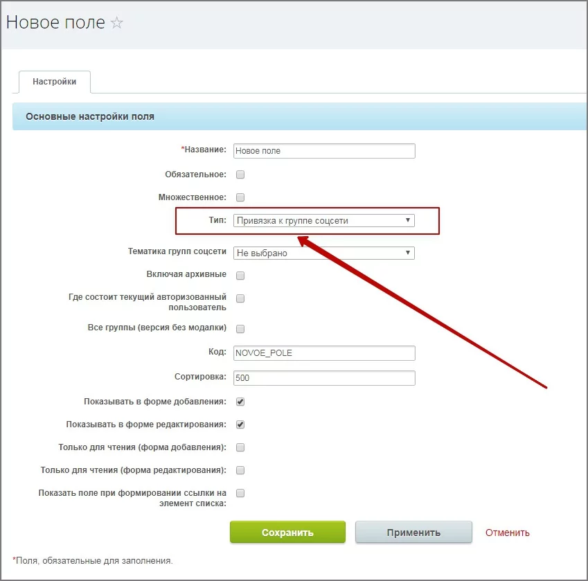Пользовательское свойство "Привязка к группе соцсети"