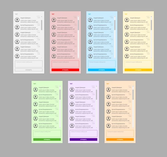 Дизайн чата адаптивный, тянется на всю ширину блока в котором он размещен. А также есть 7 цветовых тем: серая, розовая, голубая, желтая, зеленая, фиолетовая, оранжевая. Стилистика минимальная, сделано с учетом того, чтобы стиль чата без особых усилий могли подогнать под дизайн вашего сайта.